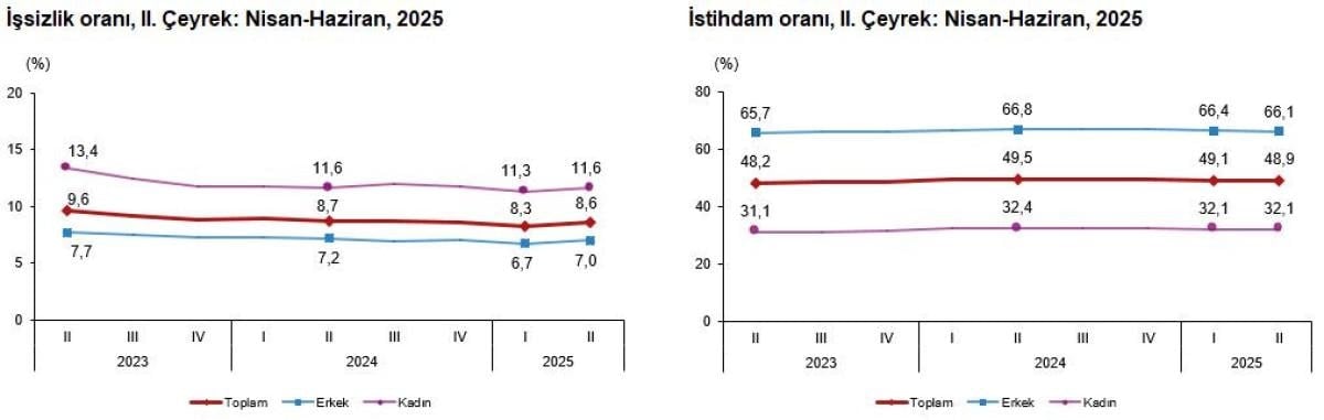 İstihdam edilenlerin sayısı 2025 yılı II. çeyreğinde bir önceki çeyreğe göre 41 bin kişi azalarak 32 milyon 435 bin kişi, istihdam oranı ise 0,2 puanlık azalış ile yüzde 48,9 oldu.