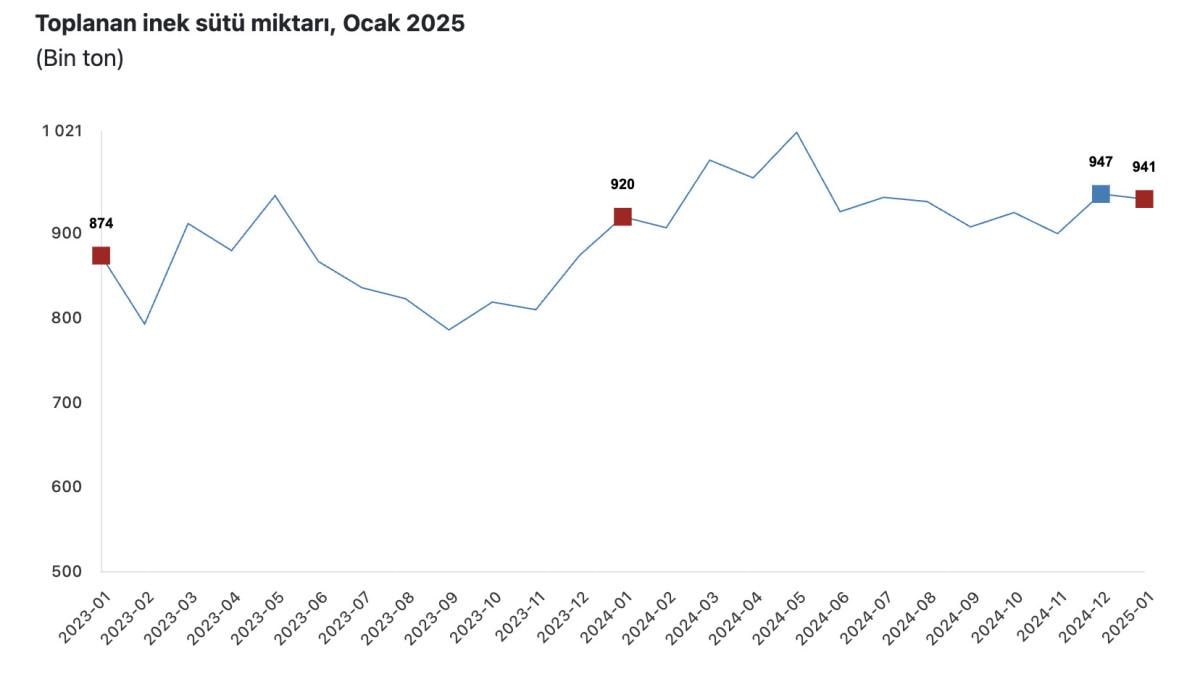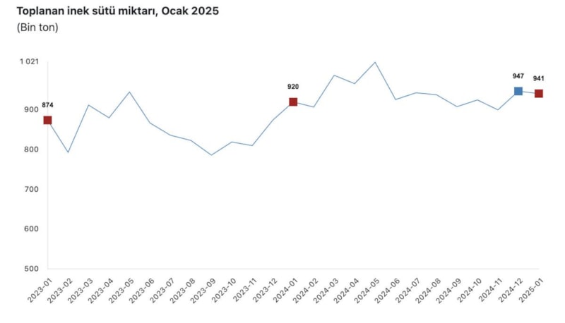 Buna göre ocak ayında ticari süt işletmeleri tarafından toplanan inek sütü miktarı, 941 bin 377 tona ulaşarak önceki ocak ayına oranla yüzde 2,3 arttı.