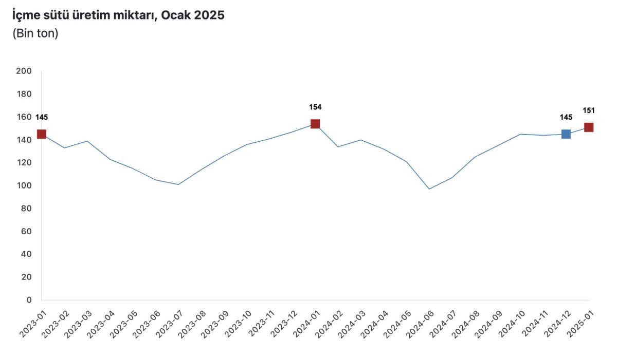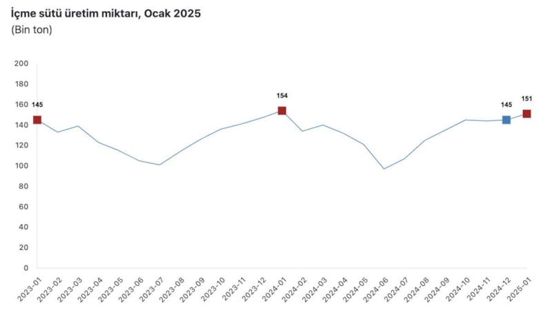 Bir önceki ay 144 bin 891 ton olan içme sütü üretimi, ocak ayında yüzde 4 oranında artarak 150 bin 681 ton olarak gerçekleşti.