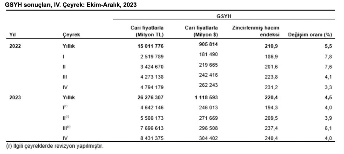 Üretim yöntemiyle Gayrisafi Yurt İçi Hasıla tahmini 2023 yılının dördüncü çeyreğinde, cari fiyatlarla bir önceki yılın aynı çeyreğine göre yüzde 75,9 artarak 8 trilyon 431 milyar 375 milyon TL oldu. GSYH'nin dördüncü çeyrek değeri cari fiyatlarla ABD doları bazında 304 milyar 402 milyon olarak gerçekleşti.