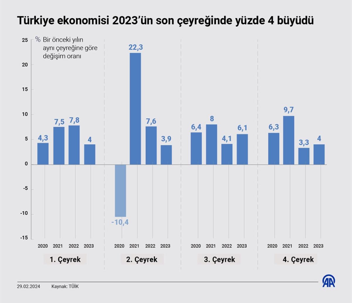 Türkiye’nin ekonomisi 2023’ün son çeyreğinde yüzde 4, yılın tamamında ise yüzde 4,5 büyüme kaydetti.