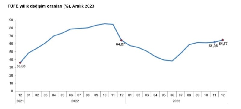 TÜFE'deki değişim 2023 yılı Aralık ayında, bir önceki aya göre yüzde 2,93, bir önceki yılın aralık ayına göre yüzde 64,77, bir önceki yılın aynı ayına göre yüzde 64,77 ve on iki aylık ortalamalara göre yüzde 53,86 olarak gerçekleşti.