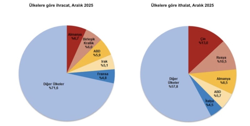 TÜİK ile Ticaret Bakanlığı iş birliğiyle genel ticaret sistemi kapsamında üretilen geçici dış ticaret verilerine göre; ihracat 2025 yılı Aralık ayında, bir önceki yılın aynı ayına göre yüzde 12,7 artarak 26 milyar 373 milyon dolar, ithalat yüzde 10,7 artarak 35 milyar 674 milyon dolar olarak gerçekleşti.