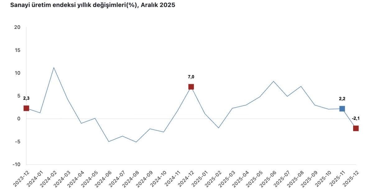 - Sanayi üretimi Aralık 2025'te yıllık yüzde 2,1 azalırken aylık yüzde 1,2 arttı.