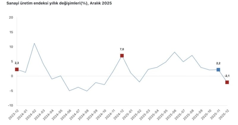 TÜİK verilerine göre, sanayi üretimi Aralık 2025 tarihinde yıllık yüzde 2,1 azalırken aylık yüzde 1,2 arttı.