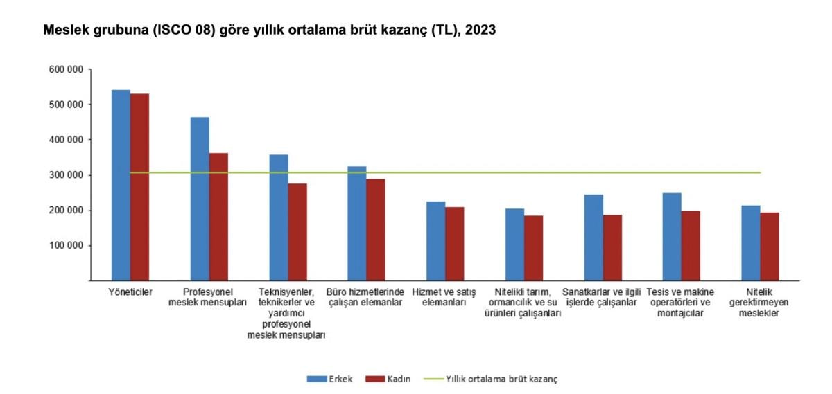 En yüksek yıllık ortalama brüt kazancı 538 bin 530 TL ile yöneticiler meslek grubunda çalışanlar elde etti. Bu meslek grubunu 409 bin 767 TL ile profesyonel meslek mensupları izledi. En düşük yıllık ortalama brüt kazanç ise 202 bin 809 TL ile nitelikli tarım, ormancılık ve su ürünleri çalışanları grubunda gerçekleşti.