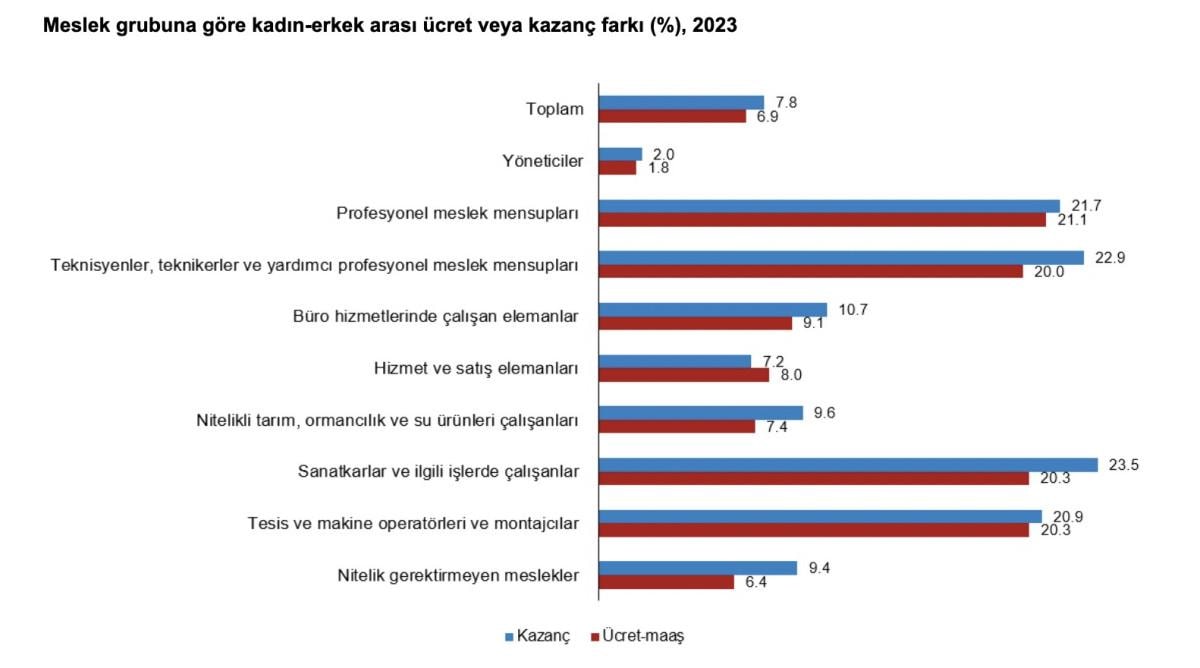 Kadın-erkek arası kazanç farkının en yüksek olduğu meslek grupları; yüzde 23,5 ile sanatkârlar ve ilgili işlerde çalışanlar ve yüzde 22,9 ile teknisyenler, teknikerler ve yardımcı profesyonel meslek mensupları olmuştur. En düşük olduğu meslek grupları ise yüzde 2,0 ile yöneticiler ve yüzde 7,2 ile hizmet ve satış elemanlarıdır.