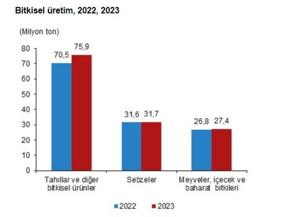 2023 yılı üretim miktarlarının yaklaşık olarak tahıllar ve diğer bitkisel ürünlerde 75,9 milyon ton; sebzelerde 31,7 milyon ton; meyveler, içecek ve baharat bitkilerinde 27,4 milyon ton olarak gerçekleşeceği tahmin edildi.