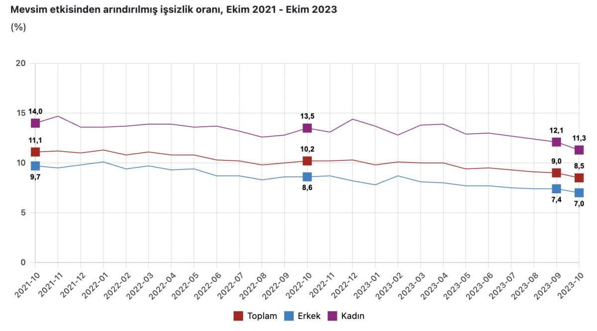 Türkiye İstatistik Kurumu (TÜİK), ekim ayına ait işsizlik oranını açıkladı. Eylül ayında mevsim etkisinden arındırılmış işsizlik oranı yüzde 9,1 seviyesinde bulunuyordu. Ekimde ise bu rakam yüzde 8,5 oldu.