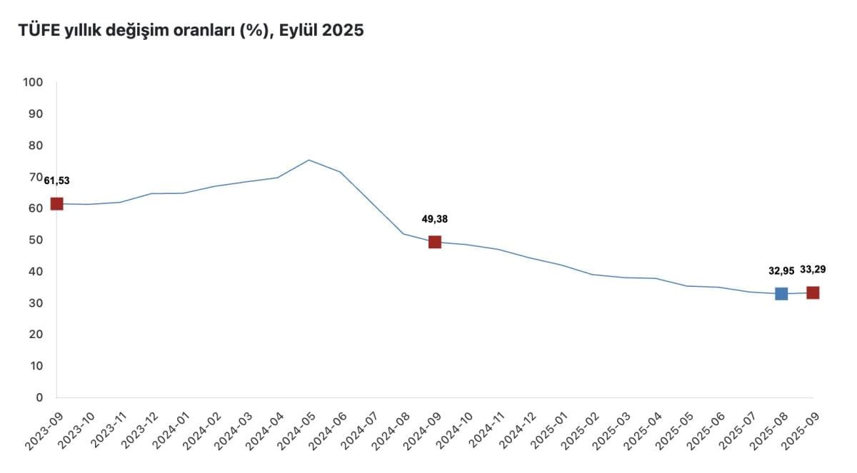 - TÜİK verilerine göre, eylülde enflasyon aylık yüzde 3,23 artışla yıllık yüzde 33,29 olarak açıklandı.