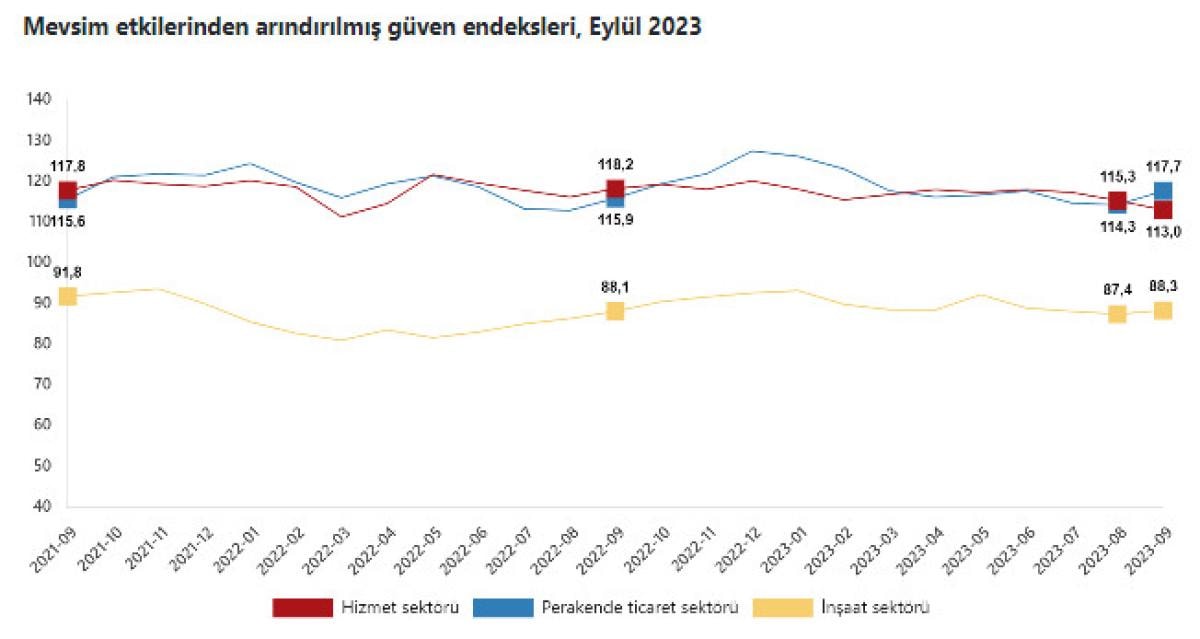Mevsim etkilerinden arındırılmış güven endeksi eylül ayında bir önceki aya göre; hizmet sektöründe yüzde 2 oranında azalarak 113 değerini, perakende ticaret sektöründe yüzde 3 oranında artarak 117,7 değerini aldı.