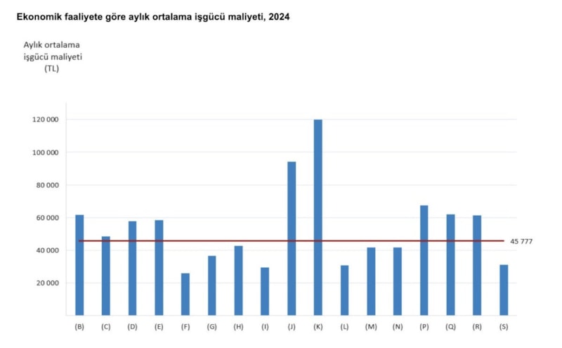 Türkiye'de geçen yıl aylık ortalama iş gücü maliyeti 45 bin 777 lira olarak gerçekleşirken iş gücü maliyetinin en yüksek olduğu sektör, finans ve sigorta faaliyetleri olarak öne çıktı.
