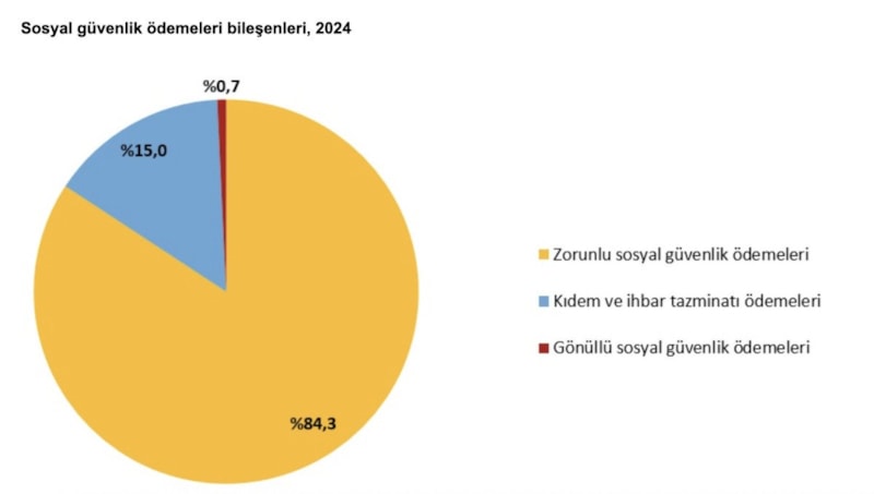 Sosyal güvenlik ödemeleri içinde en büyük payı yüzde 84,3 ile zorunlu sosyal güvenlik ödemeleri alırken gönüllü sosyal güvenlik ödemelerinin oranı yüzde 0,7 oldu.