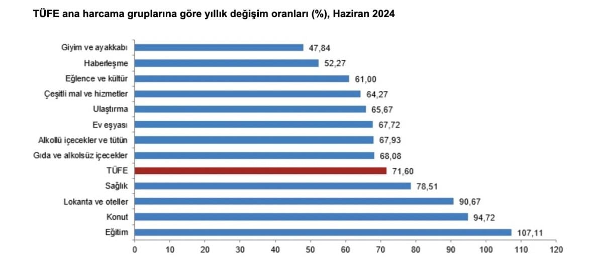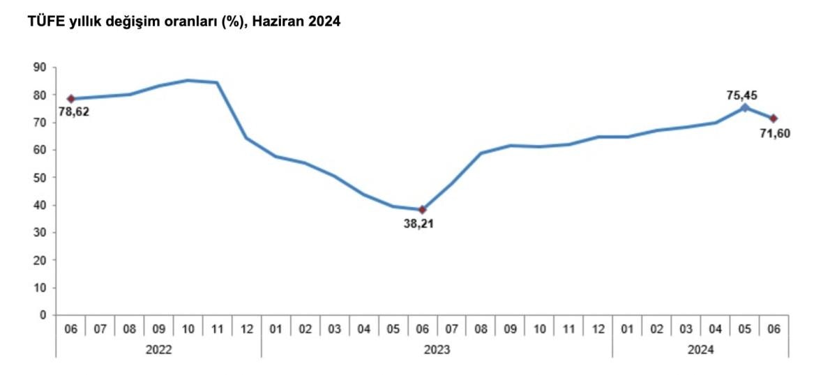 TÜFE'deki değişim 2024 yılı Haziran ayında; bir önceki aya göre yüzde 1,64, bir önceki yılın Aralık ayına göre yüzde 24,73, bir önceki yılın aynı ayına göre yüzde 71,60 ve on iki aylık ortalamalara göre yüzde 65,07 olarak gerçekleşti.