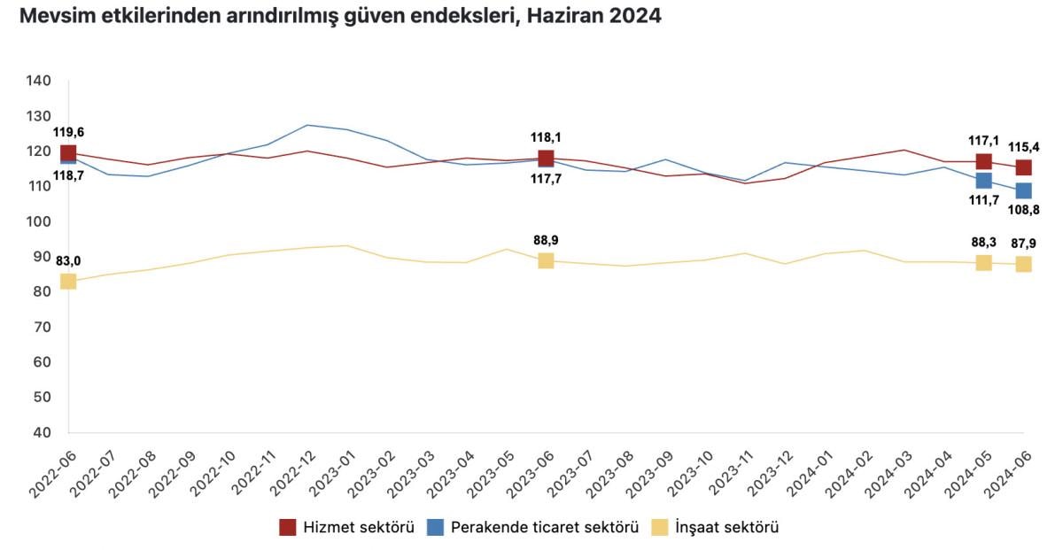Mevsim etkilerinden arındırılmış güven endeksi Haziran ayında, bir önceki aya göre hizmet sektöründe yüzde 1,5 oranında azalarak 115,4 değerini, perakende ticaret sektöründe yüzde2 ,6 oranında azalarak 108,8 değerini aldı.
