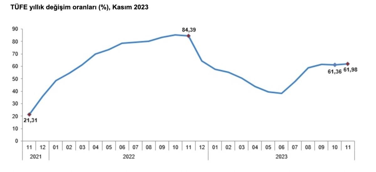 TÜFE'deki (2003=100) değişim 2023 yılı Kasım ayında, bir önceki aya göre yüzde 3,28, bir önceki yılın aralık ayına göre yüzde 60,09, bir önceki yılın aynı ayına göre yüzde 61,98 ve on iki aylık ortalamalara göre yüzde 53,40 olarak gerçekleşti.