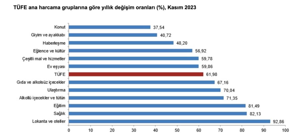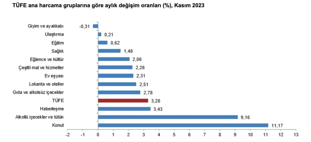 Buna karşılık 2023 yılı Kasım ayında, bir önceki aya göre artışın en yüksek olduğu ana grup ise yüzde 11,17 ile konut oldu (ana harcama gruplarına göre endeksler, ağırlıklar ve değişim oranları Ek Tablo-1'dedir).
