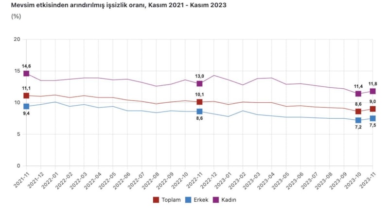 TÜİK, kasım ayına ait iş gücü istatistiklerini paylaştı. Mevsim etkisinden arındırılmış işsizlik oranı yüzde 9 seviyesinde gerçekleşti.