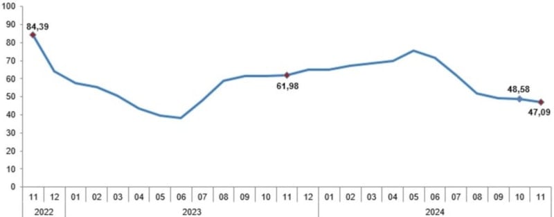 TÜFE'deki değişim 2024 yılı kasım ayında bir önceki aya göre yüzde 2,24, bir önceki yılın aralık ayına göre yüzde 42,91, bir önceki yılın aynı ayına göre yüzde 47,09 ve on iki aylık ortalamalara göre yüzde 60,45 olarak gerçekleşti.