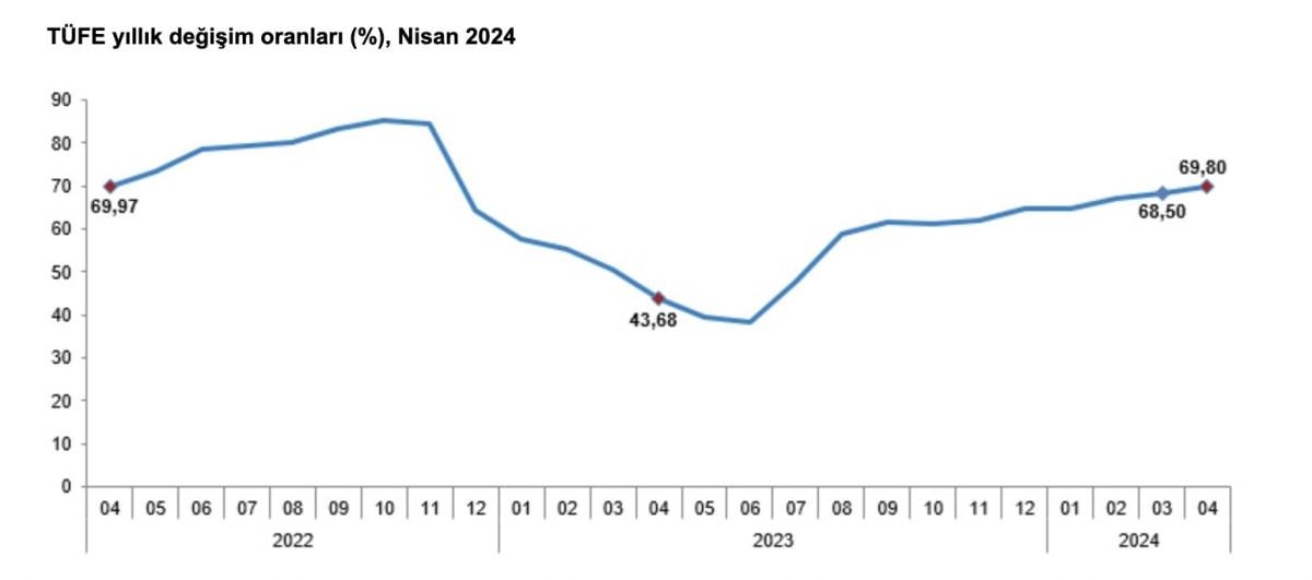 TÜFE'deki değişim 2024 yılı Nisan ayında, bir önceki aya göre yüzde 3,18, bir önceki yılın aralık ayına göre yüzde 18,72, bir önceki yılın aynı ayına göre yüzde 69,80 ve on iki aylık ortalamalara göre yüzde 59,64 olarak gerçekleşti.