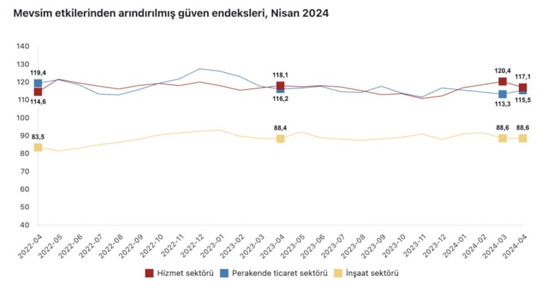 Mevsim etkilerinden arındırılmış güven endeksi nisan ayında, bir önceki aya göre hizmet sektöründe yüzde 2,8 oranında azalarak 117,1 değerini, perakende ticaret sektöründe yüzde 1,9 oranında artarak 115,5 değerini aldı.