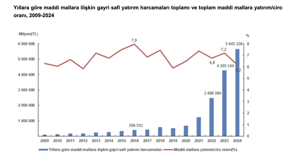 Maddi mallara ilişkin gayrisafi yatırım harcamaları 2024 yılında 5 trilyon 645 milyar TL olarak gerçekleşti. Maddi mallara ilişkin gayrisafi yatırım harcamalarının 1 trilyon 737 milyar TL'si imalat sektöründe, 885 milyar TL'si toptan ve perakende ticaret sektöründe, 617 milyar TL'si ulaştırma ve depolama sektöründe faaliyet gösteren girişimler tarafından yapıldı.