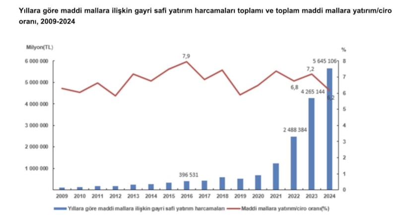Türkiye'de 2024'te maddi mallara 5 trilyon 645 milyar liralık gayrisafi yatırım harcaması yapıldı.