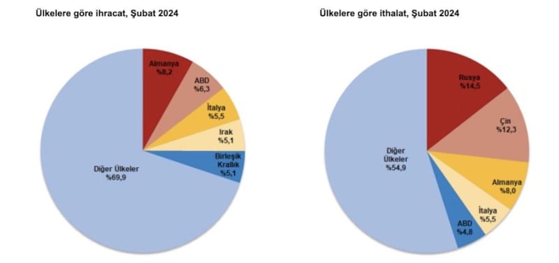 İthalatta Rusya Federasyonu ilk sırayı aldı. Şubat ayında Rusya Federasyonu'ndan yapılan ithalat 4 milyar 27 milyon dolar olurken, bu ülkeyi sırasıyla; 3 milyar 434 milyon dolar ile Çin, 2 milyar 218 milyon dolar ile Almanya, 1 milyar 543 milyon dolar ile İtalya, 1 milyar 337 milyon dolar ile ABD izledi. İlk 5 ülkeden yapılan ithalat, toplam ithalatın yüzde 45,1'ini oluşturdu.