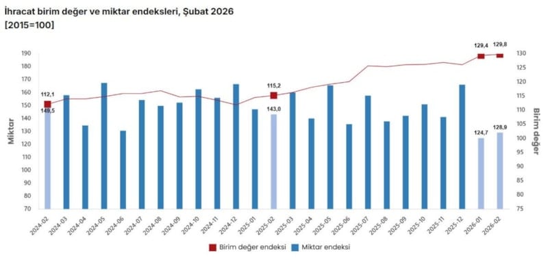 TÜİK, Şubat 2026 dönemine ilişkin dış ticaret endekslerini açıkladı. Buna göre, ihracat birim değer endeksi şubat ayında bir önceki yılın aynı ayına göre yüzde 12,7 arttı.