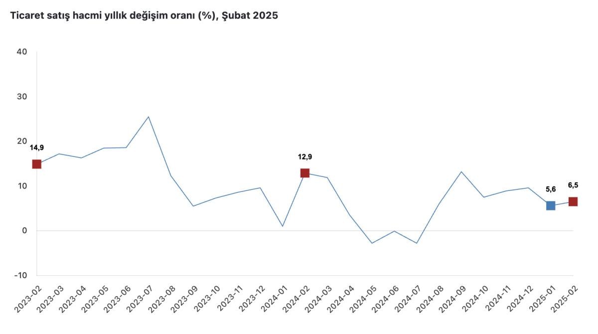 Takvim etkisinden arındırılmış ticaret ciro endeksi şubatta, geçen yılın aynı ayına göre yüzde 34,4, mevsim ve takvim etkilerinden arındırılmış ticaret ciro endeksi de bir önceki aya göre yüzde 4 artış gösterdi.