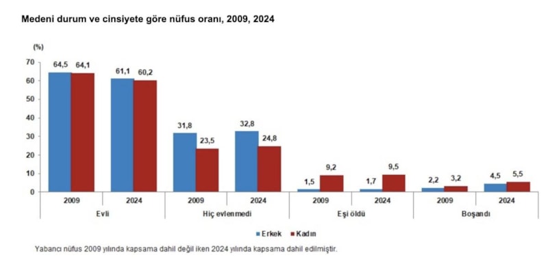 Ülkemizde 2009 ve 2024 yılı cinsiyete göre medeni durumun dağılımı incelendiğinde, erkeklerde hiç evlenmeyenlerin oranının kadınlara göre daha yüksek olduğu, kadınlarda ise eşi ölenlerin ve boşananların oranının erkeklerden daha fazla olduğu görüldü.