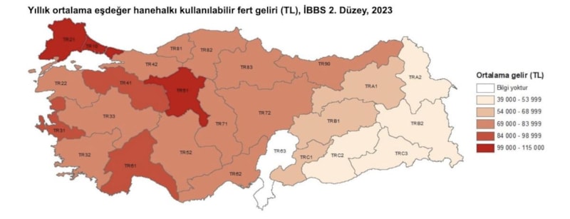 Araştırma sonuçlarına göre, Türkiye'de yıllık ortalama eş değer hanehalkı kullanılabilir fert geliri 2023 yılında 83 bin 808 TL iken, İBBS 2. Düzey bölgeleri itibarıyla en yüksek olduğu bölge 114 bin 634 TL ile TR10 (İstanbul) bölgesi oldu. Bu bölgeyi, 108 bin 36 TL ile TR51 (Ankara) bölgesi ve 101 bin 372 TL ile TR21 (Tekirdağ, Edirne, Kırklareli) bölgesi izledi. En düşük yıllık ortalama eş değer hanehalkı kullanılabilir fert geliri ise 39 bin 173 TL ile TRB2 (Van, Muş, Bitlis, Hakkari) bölgesinde gerçekleşti.