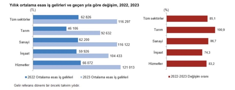 Esas iş gelirleri sektörel ayrımda incelendiğinde; en yüksek yıllık ortalama gelirin 121 bin 013 TL ile hizmet sektöründe, en düşük yıllık ortalama gelirin ise 92 bin 632 TL ile tarım sektöründe olduğu görüldü. Bir önceki yıla göre; yıllık ortalama esas iş gelirinde en yüksek artış yüzde 100,9 ile tarım sektöründe gözlenirken, bunu yüzde 86,7 ile sanayi sektörü izledi. Diğer taraftan hizmet sektöründe yüzde 83,2, inşaat sektöründe ise yüzde 74,3 artış gözlendi.