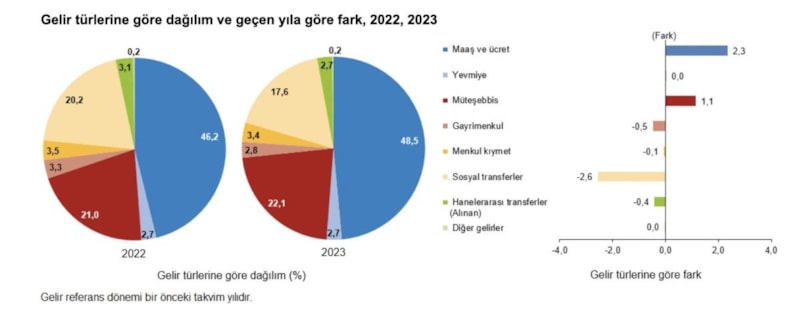 Toplam gelir içerisinde en yüksek payı, yüzde 48,5 ile bir önceki yıla göre 2,3 puan artan maaş ve ücret geliri aldı. İkinci sırayı yüzde 22,1 ile önceki yıla göre 1,1 puan artan müteşebbis geliri alırken üçüncü sırayı yüzde 17,6 ile önceki yıla göre 2,6 puanlık azalış gösteren sosyal transfer geliri oluşturdu.