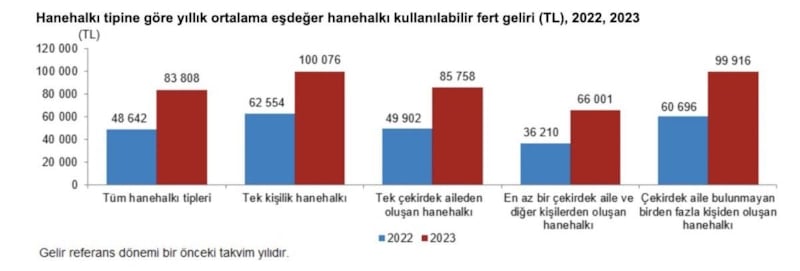 Yıllık ortalama eşdeğer hanehalkı kullanılabilir fert gelirlerinde en yüksek gelir, geçen yıla göre 37 bin 522 TL artarak 100 bin 076 TL ile tek kişilik hanehalklarının oldu. Çekirdek aile bulunmayan birden fazla kişiden oluşan hanehalklarının yıllık ortalama eş değer hanehalkı kullanılabilir fert geliri 99 bin 916 TL iken tek çekirdek aileden oluşan hanehalklarında bu değer 85 bin 758 TL oldu. En düşük yıllık ortalama eş değer kullanılabilir hanehalkı fert gelirine sahip hanehalkı tipi ise 66 bin 001 TL ile en az bir çekirdek aile ve diğer kişilerden oluşan hanehalkları oldu.