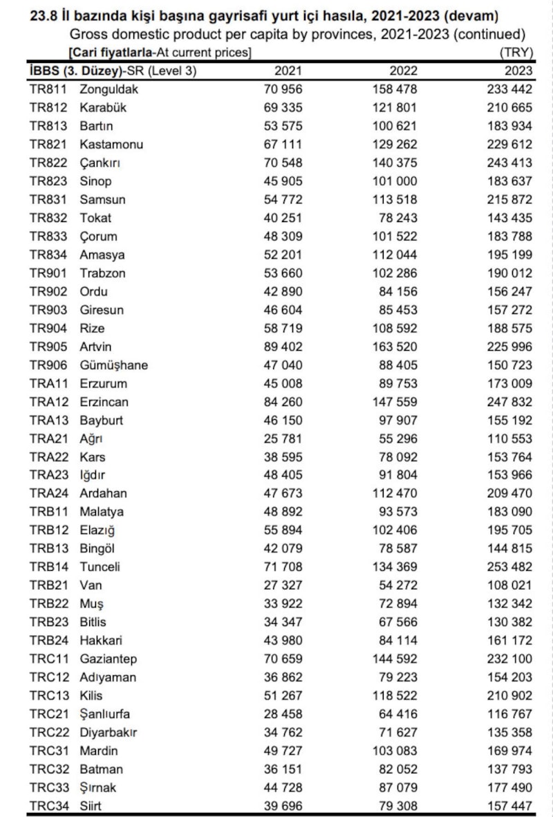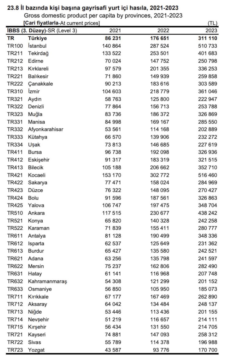 Verilere göre 2023 yılında kişi başına gayrisafi yurt içi hasılaya göre Türkiye’nin en zengin 20 ili (cari fiyatlarla, TL) şöyle: