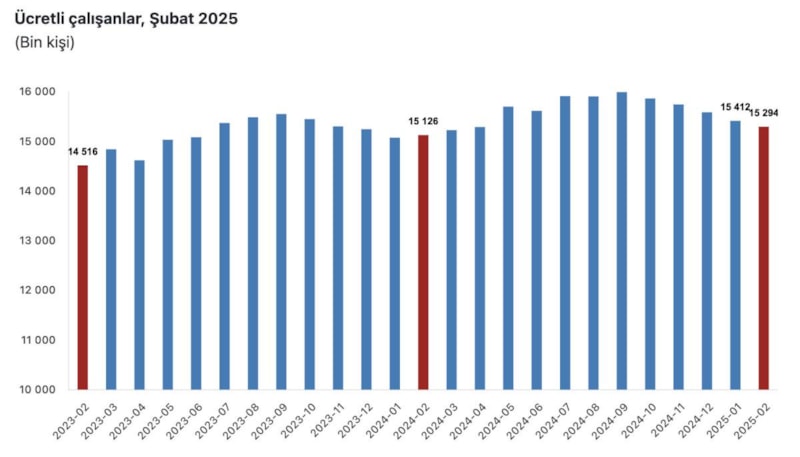 Ücretli çalışan sayısı, bir önceki yılın aynı ayında 15 milyon 125 bin 704 kişi iken, 2025 yılı Şubat ayında 15 milyon 293 bin 843 kişi oldu.