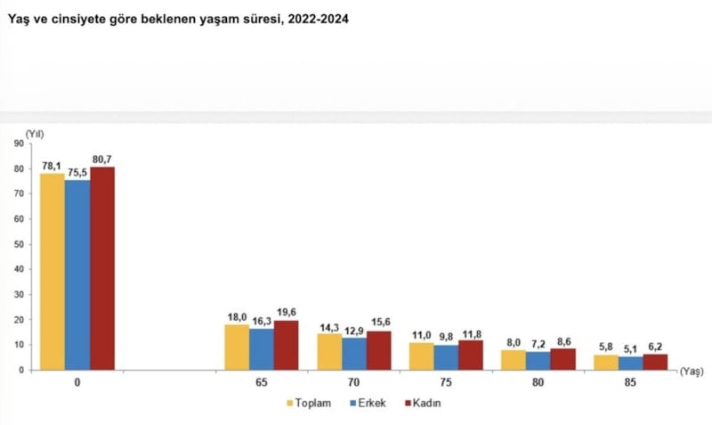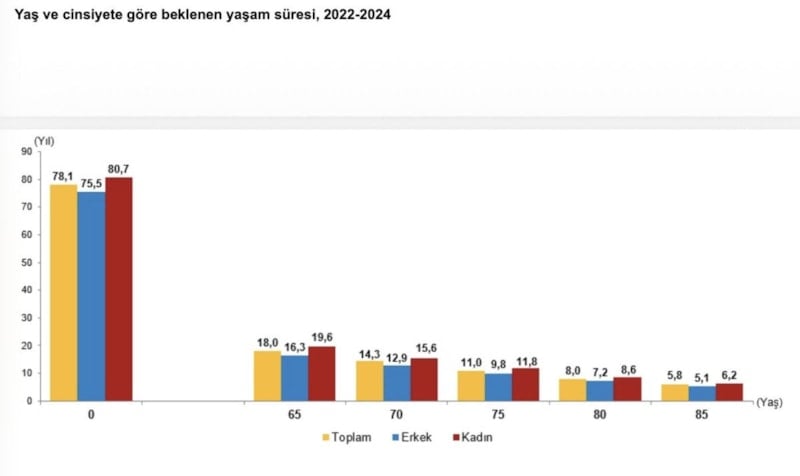 Türkiye’de 65 yaşına ulaşan bir kişinin beklenen yaşam süresi ortalama 18 yıl olarak belirlendi. Bu süre erkeklerde 16,3 yıl, kadınlarda ise 19,6 yıl oldu. Başka bir ifadeyle 65 yaşına ulaşan kadınların erkeklerden ortalama 3,3 yıl daha fazla yaşayacağı tahmin ediliyor.