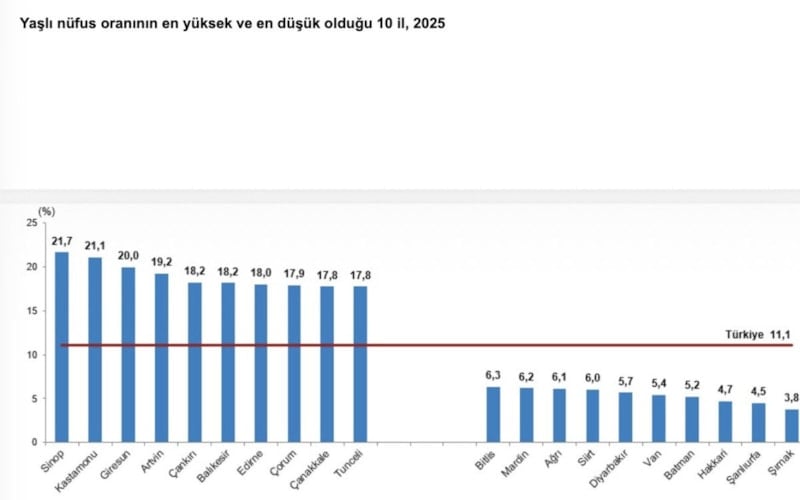 2025 yılında yaşlı nüfus oranının en yüksek olduğu il yüzde 21,7 ile Sinop oldu. Sinop’u yüzde 21,1 ile Kastamonu ve yüzde 20,0 ile Giresun izledi.
