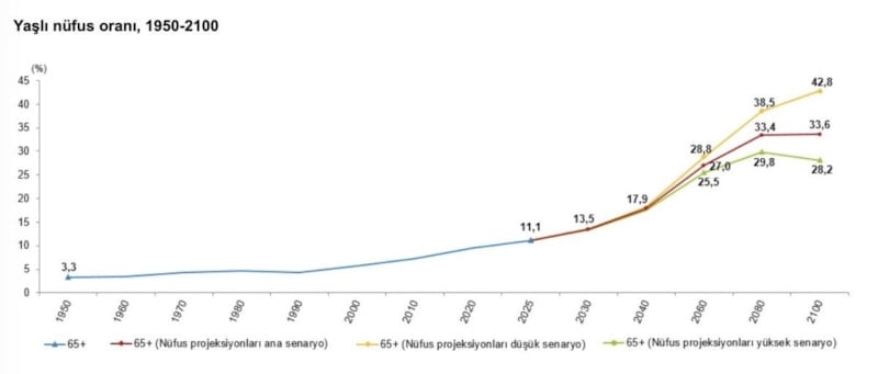 Nüfus projeksiyonlarının demografik göstergelerdeki mevcut yapının devam edeceğini varsayan ana senaryosuna göre yaşlı nüfus oranının 2030 yılında yüzde 13,5, 2040 yılında yüzde 17,9, 2060 yılında yüzde 27, 2080 yılında yüzde 33,4 ve 2100 yılında yüzde 33,6 olacağı öngörüldü.