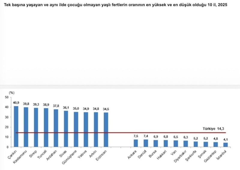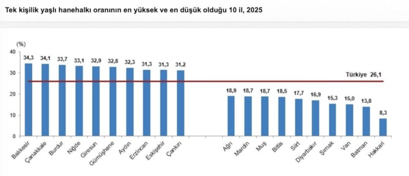 En az bir yaşlı fert bulunan haneler içinde tek kişilik yaşlı hanehalkı oranının en yüksek olduğu il, 2025 yılında yüzde 34,3 ile Balıkesir oldu. Bu ili yüzde 34,1 ile Çanakkale, yüzde 33,7 ile Burdur izledi. Bu oranın en düşük olduğu il ise yüzde 8,3 ile Hakkari oldu. Bu ili yüzde 13,8 ile Batman, yüzde 15,0 ile Van izledi.