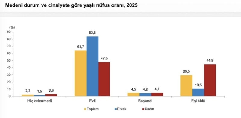 Yaşlı nüfusun 2025 yılında yüzde 44,7'sini erkek nüfus, yüzde 55,3'ünü kadın nüfus oluşturdu.