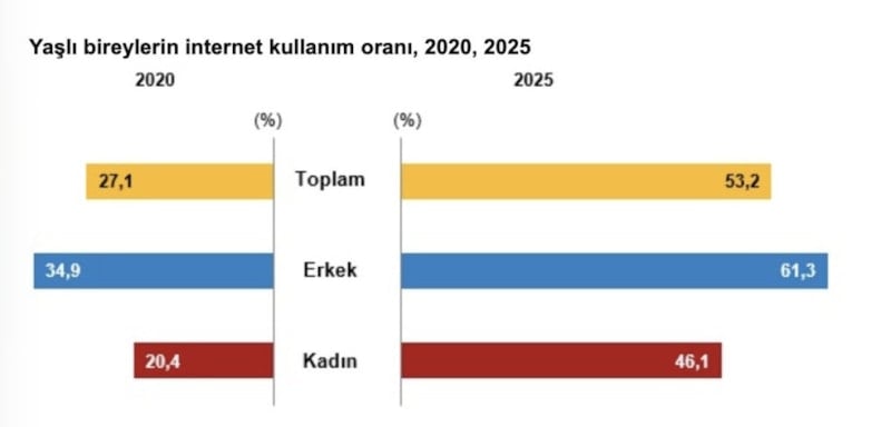 Hanehalkı Bilişim Teknolojileri Kullanım Araştırması sonuçlarına göre, 65-74 yaş grubunda internet kullananların oranı 2020 yılında yüzde 27,1 iken 2025 yılında yüzde 53,2’ye yükseldi.