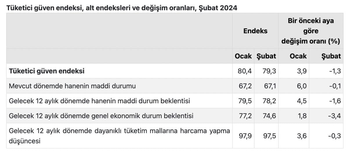 TÜİK ve Türkiye Cumhuriyet Merkez Bankası (TCMB) iş birliği ile yürütülen tüketici eğilim anketi sonuçlarından hesaplanan tüketici güven endeksi, ocak ayında 80,4 iken şubat ayında yüzde 1,3 oranında azalarak 79,3 oldu.