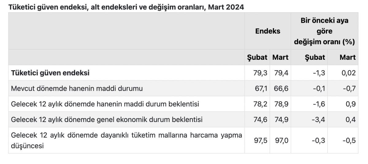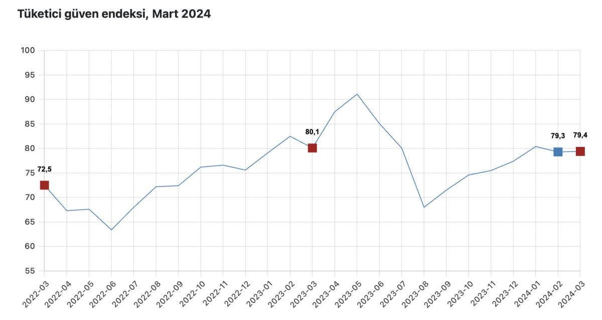 TÜİK ve Türkiye Cumhuriyet Merkez Bankası (TCMB) iş birliği ile yürütülen tüketici eğilim anketi sonuçlarından hesaplanan tüketici güven endeksi, şubat ayında 79,3 iken mart ayında yüzde 0,02 oranında artarak 79,4 oldu.