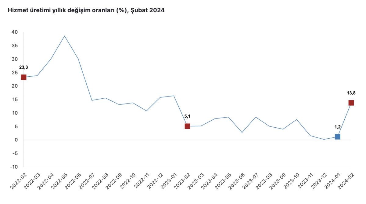 Hizmet üretim endeksi 2024 yılı Şubat ayında, bir önceki yılın aynı ayına göre yüzde 13,8 arttı. Aynı ayda ulaştırma ve depolama hizmetleri yüzde 14,3 arttı, konaklama ve yiyecek hizmetleri yüzde 18 arttı, bilgi ve iletişim hizmetleri yüzde 15,3 arttı, gayrimenkul hizmetleri yüzde 15,8 arttı, mesleki, bilimsel ve teknik hizmetler yüzde 15,4 arttı, idari ve destek hizmetleri ise yüzde 7,5 arttı.