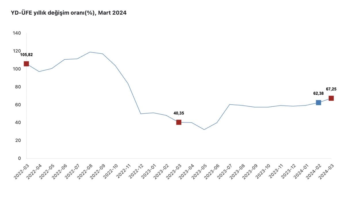 Yurt Dışı Üretici Fiyat Endeksi (YD-ÜFE) 2024 yılı Mart ayında, bir önceki aya göre yüzde 4,70 artış, bir önceki yılın aralık ayına göre yüzde 12,10 artış, bir önceki yılın aynı ayına göre yüzde 67,25 artış ve on iki aylık ortalamalara göre yüzde 55,14 artış gösterdi.