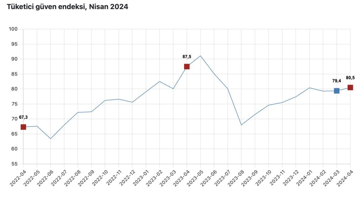 TÜİK ve Türkiye Cumhuriyet Merkez Bankası (TCMB) iş birliği ile yürütülen tüketici eğilim anketi sonuçlarından hesaplanan tüketici güven endeksi, mart ayında 79,4 iken nisan ayında yüzde 1,4 oranında artarak 80,5 oldu.