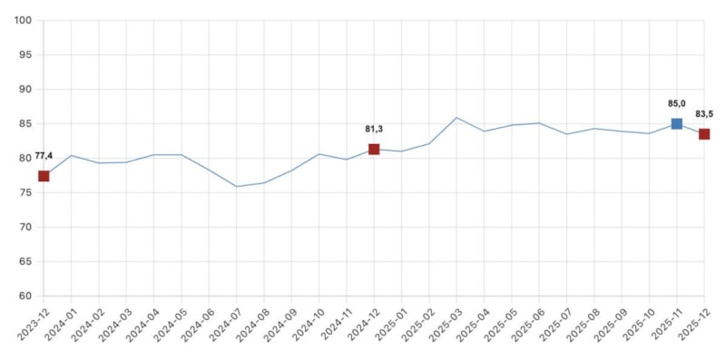 TÜİK'in açıkladığı tüketici güven endeksi, kasım ayında 85 iken aralık ayında yüzde 1,8 oranında azalarak 83,5'e geriledi.