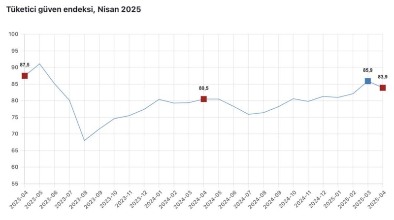 TÜİK ve Türkiye Cumhuriyet Merkez Bankası (TCMB) iş birliği ile yürütülen tüketici eğilim anketi sonuçlarından hesaplanan tüketici güven endeksi, mart ayında 85,9 iken nisan ayında yüzde 2,3 oranında azalarak 83,9 oldu.